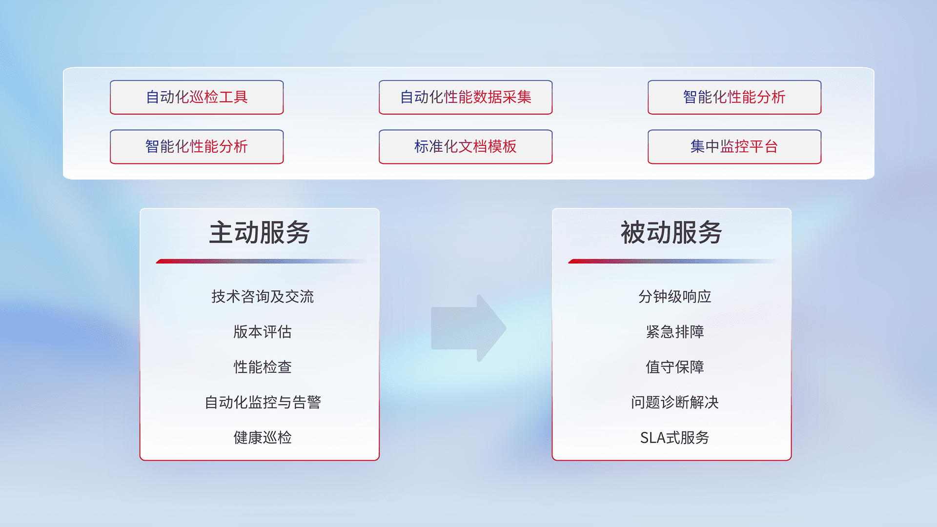 智能化工具和标准化文档,,保障服务质量,,提供主动服务(包含技术咨询、、、、版本评估、、、、性能检查、、自动化监控与告警、、健康巡检)和被动服务包含(分钟级响应、、、紧急排障、、、、值守保障、、、、问题诊断解决、、、、SLA服务)。。。。